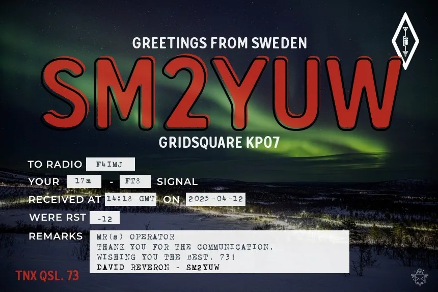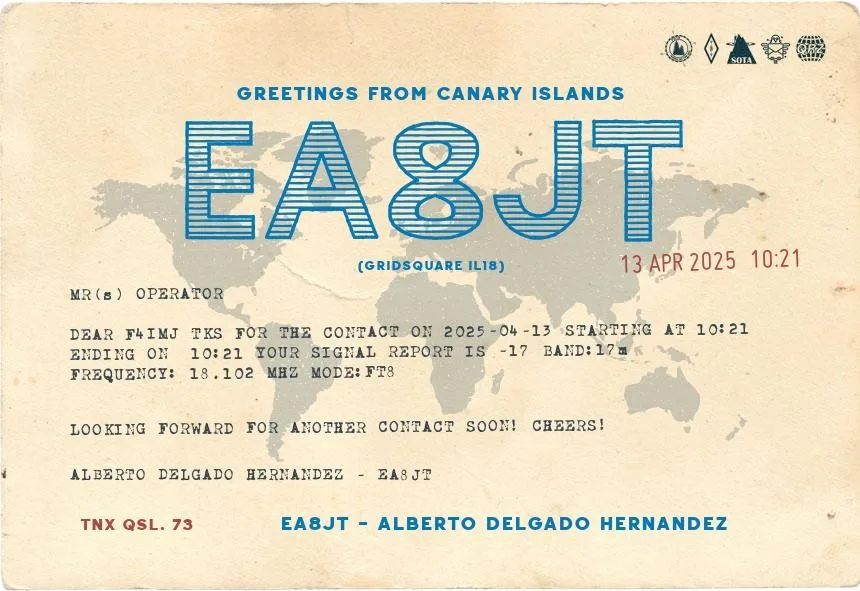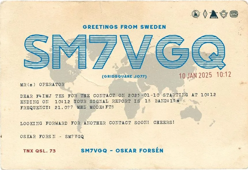 Sur cette page, je vous partage les eQSL que j’ai reçues à la suite de mes contacts radio avec d’autres radioamateurs aux quatre coins du globe, au fil des ondes. Peut-être y trouverez-vous la vôtre ? Dans le cas contraire, qu’attendez-vous pour prendre contact ? Hi… À très vite sur les fréquences !